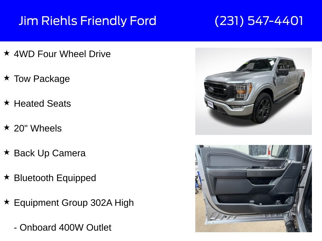 Welcome to Jim Riehlâs Friendly Ford, located in the beautiful city of Charlevoix! Thank you for stopping by to take a look at our 2022 Ford F-150 XLT. This beautiful pre-owned vehicle has been fully reconditioned and is ready to find its new driveway! Maybe yours? Our reconditioning process is the best in the industry, this vehicle has been fully serviced and cosmetically restored. We stand behind our pre-owned vehicles with a 3mo/3,000 powertrain warranty included. Enjoy the benefits you get by purchasing a Jim Riehl Premium pre-owned vehicle: First oil change on the house Complimentary VIP service pick up delivery services âThe best used car you can buyâ Priority service appointment availability Peace of mind that you know you are buying the best used car on the road! Thank you for choosing Jim Riehlâs Friendly Ford for your vehicle needs, we look forward to servicing them! Call, Click or stop by today to see why everyone is choosing Jim Riehl for their next vehicle!